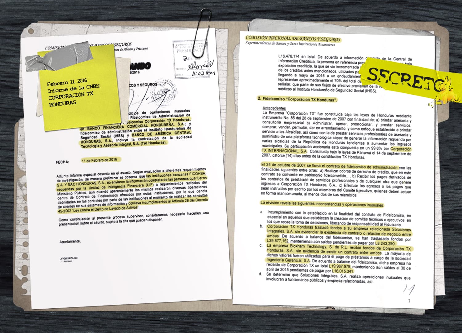 Según un informe de la Comisión Nacional de Bancos y Seguros – CNBS de 2016, Corporación TX comenzó a transferir dinero a empresas, con cuentas bancarias en FICOHSA: trasladó, sin justificación o contrato, 20 millones de Lempiras a la empresa Bloxham Technology, S. de R.L. y más de 39 millones de Lempiras a la empresa Soluciones Integrales S.A. – SISA, esta última también dirigida por Álvaro Delgado. La mayoría de fondos de Bloxham, fueron trasladados a las cuentas de Ingeniería Gerencial de Arturo Corrales, ex ministro de seguridad (2011-2013). \