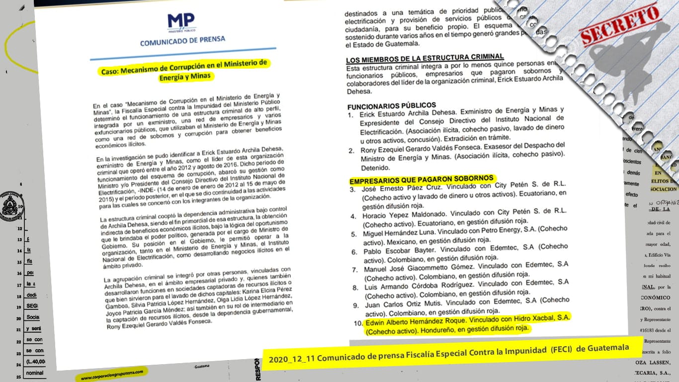 Según investigaciones de la FECI se habrían pagado al ministro guatemalteco Erick Estuardo Archila más de 477 mil dólares en soborno entre 2012 y 2015. Un caso criminal más, respaldado con evidencias y expuesto en nuestro programa y periódico digital El Perro Amarillo, del cual hará caso omiso Óscar Fernando Chinchilla, Fiscal General de la República de Honduras; ciego, sordo y mudo, impedido pues de socorrer a la Interpol para encontrar al prófugo testaferro Fredy Nasser.
