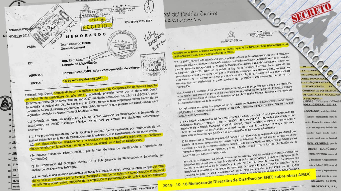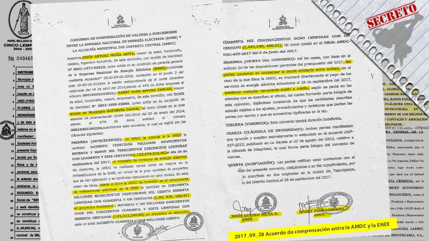 En septiembre de 2017, Tito Asfura y Jesús Arturo Mejía, ex gerente de la Empresa Nacional de Energía Eléctrica – ENEE, firmaron un convenio de compensación de deuda de energía por tiempo indefinido, para canjear la deuda de electricidad de la Alcaldía por obras de mejora en la infraestructura de la ENEE, cuestión que fue desmentida años después por la misma Unidad de Gestión y Negociación de Deuda de la ENEE, que reportó que las obras sujeto del contrato, no conllevan beneficios en la capacidad de la red de distribución de la ENEE, “son obras civiles que no debieron incluirse en la compensación”.
