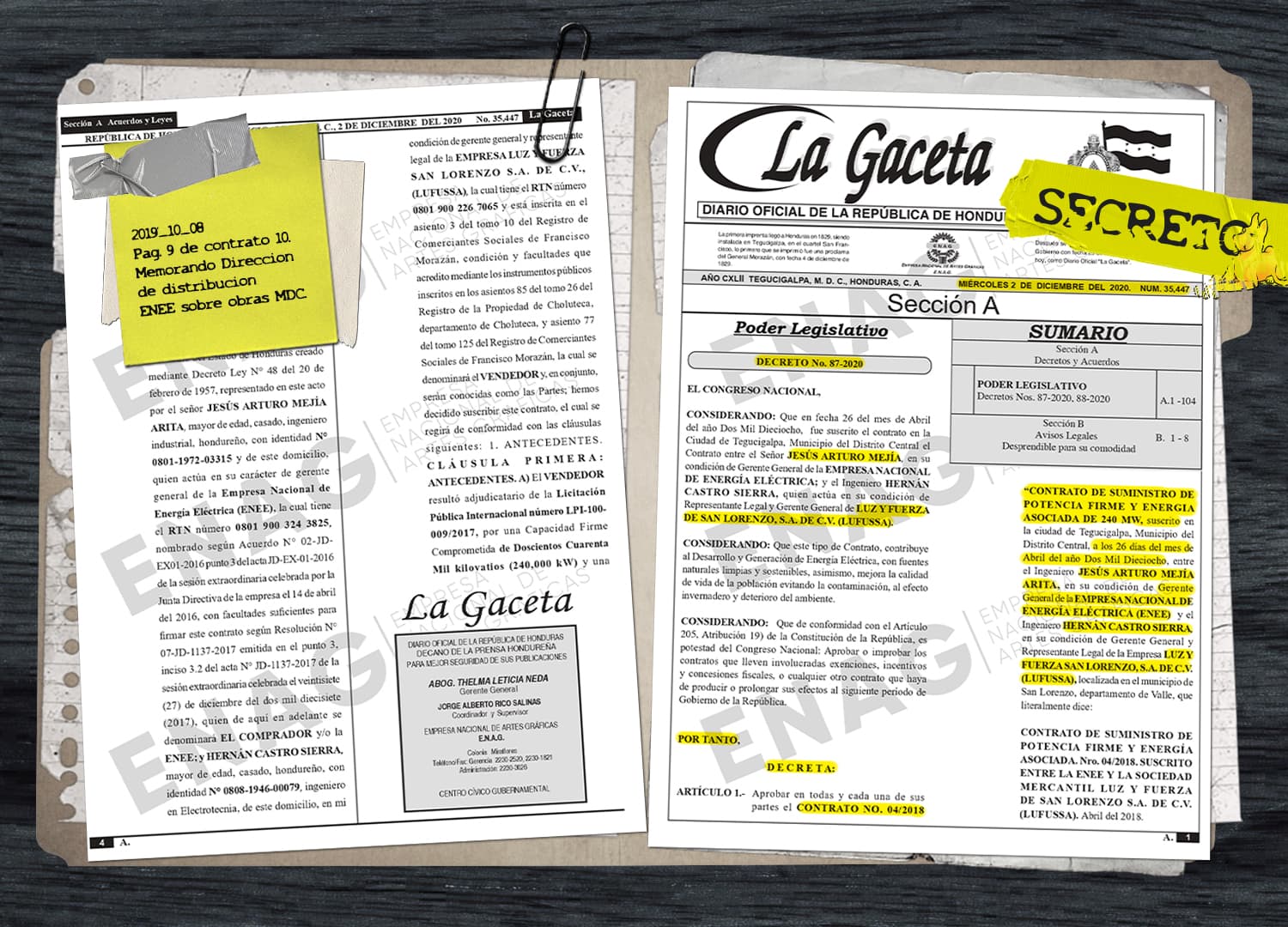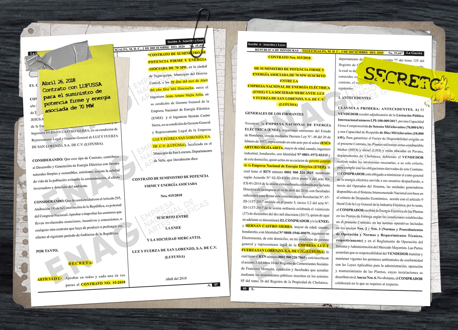 El contrato con LUFUSSA terminó en 2014, pero Jesús Arturo Mejía, durante su gestión como Gerente de la ENEE (2016-2018), firmó otros dos contratos de generación con Kafie: LUFUSSA I y LUFUSSA II, valorados en casi 2 mil millones de Lempiras, sin contar los costos variables de combustible y los intereses de mora por atraso de pago.